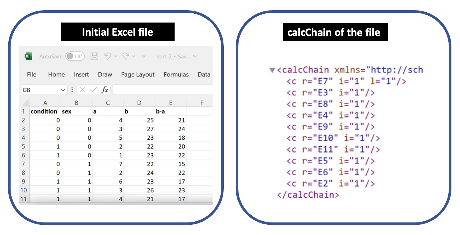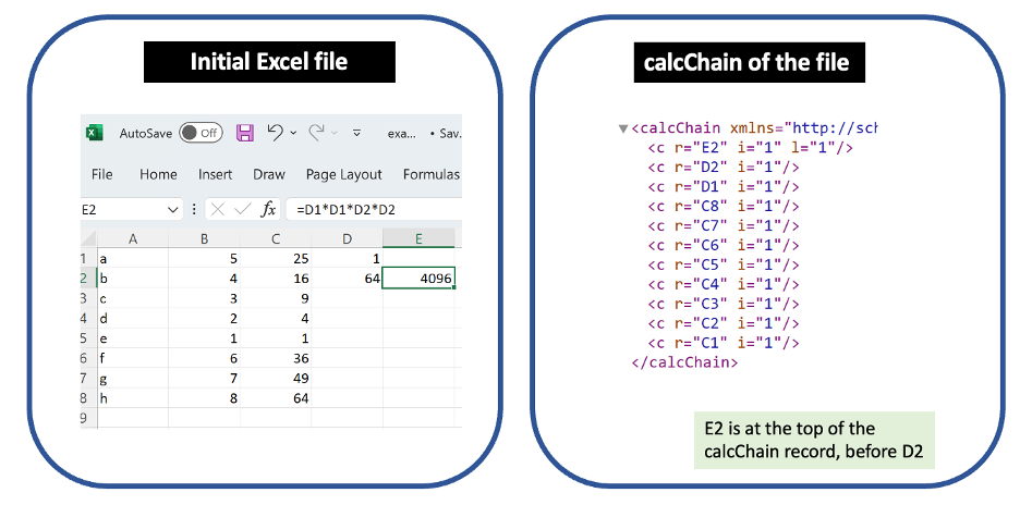Microsoft’s documentation for Excel files shows how calcChain can change on its own: “if a set of formulas that were previously ignored during a calculation become required for calculation…, then these formulas move to ‘first’ on the calculation chain so they can be evaluated.” This makes sense: By all indications, Microsoft’s main goal with calcChain is to calculate formulas as quickly as possible. (Imagine if some competitor did this better, and beat Excel in a speed test.) And optimizing speed means reordering the calculations into whatever order finishes the calculations fastest.