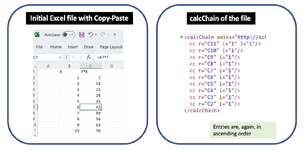 Next, I changed this initial Excel file by Copy-Paste of the values in B7 and C7 from row 7 into row 12, and then deleted row 7. The calcChain after these actions is exactly the same as the initial file despite the reordering.
