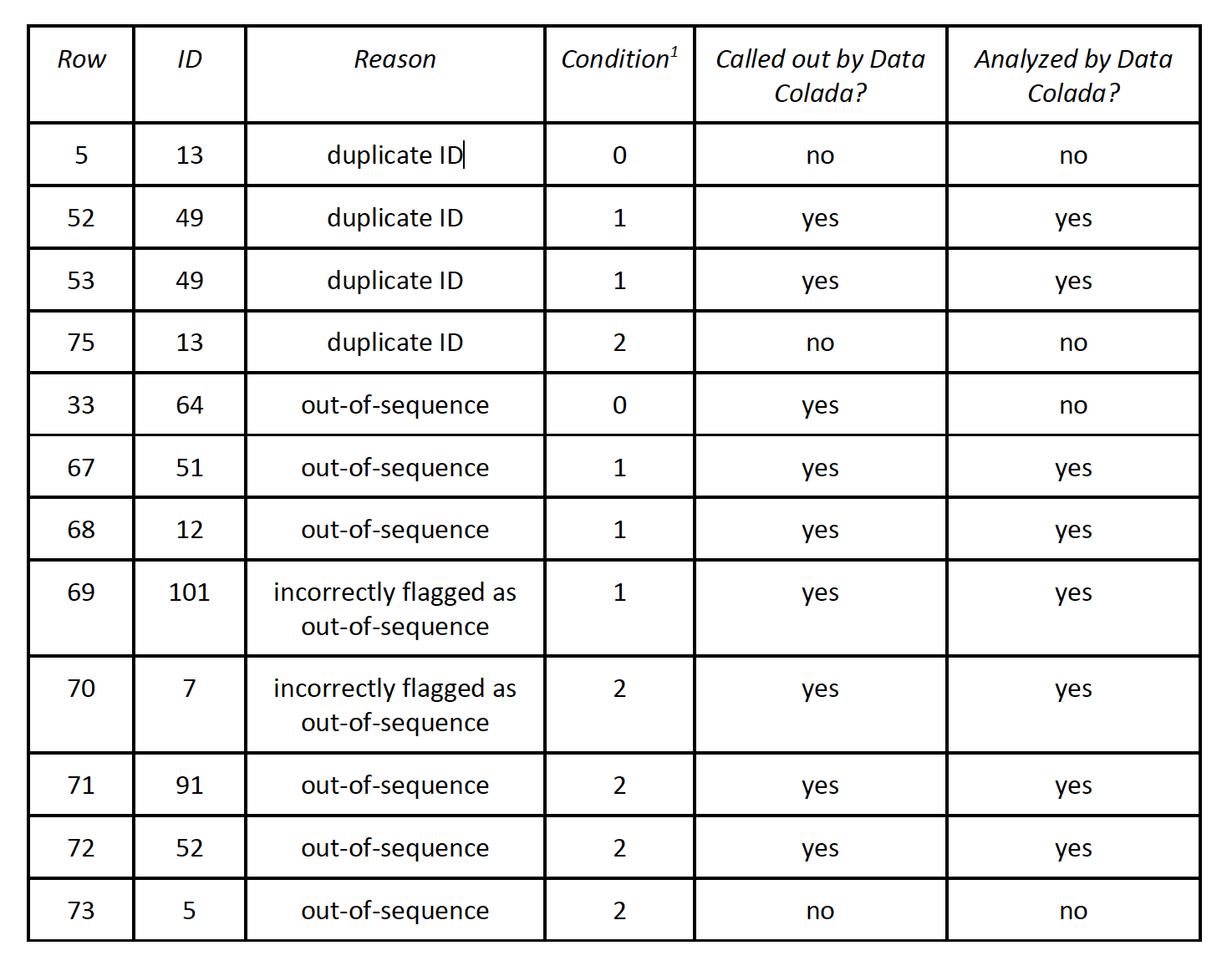 In their analysis, Data Colada describes the rule they use to highlight out-of-sequence observations in the following way: within each condition, an out-of-sequence observation is one where the ID is not in ascending order. For instance, the series 2, 3, 10 is in sequence. But in the series 2, 10, 3, Data Colada would call out 3 as out of sequence, expecting 3 to show up between 2 and 10. Simple as this sounds, for some reason Data Colada misapplies its own rule, without any explanation.